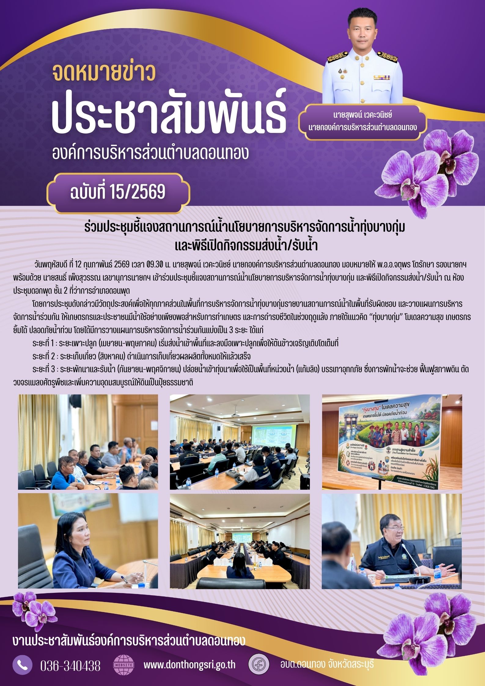 นายสุพจน์ เวคะวนิชย์ นายกองค์การบริหารส่วนตำบลดอนทอง มอบหมายให้ พ.อ.อ.จตุพร โตรักษา รองนายกฯ พร้อมด้วย นายสนธิ์ เพ็งสุวรรณ เลขานุการนายกฯ เข้าร่วมประชุมชี้แจงสถานการณ์น้ำนโยบายการบริหารจัดการน้ำทุ่งบางกุ่ม และพิธีเปิดกิจกรรมส่งน้ำ/รับน้ำ ณ ห้องประชุมดอกพุด ชั้น 2 ที่ว่าการอำเภอดอนพุด