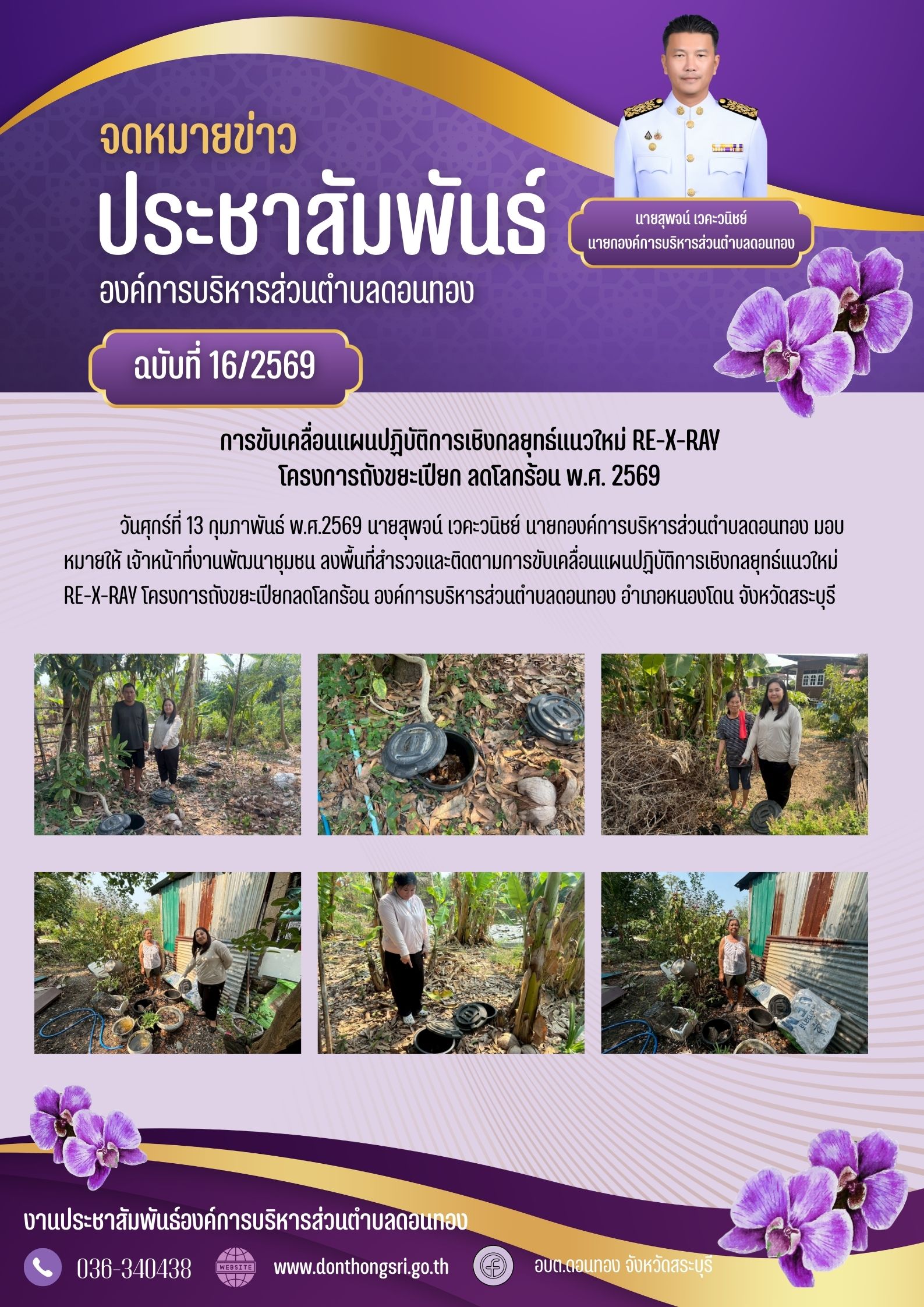 วันศุกร์ที่ 13 กุมภาพันธ์ พ.ศ.2569 นายสุพจน์ เวคะวนิชย์ นายกองค์การบริหารส่วนตำบลดอนทอง มอบหมายให้ เจ้าหน้าที่งานพัฒนาชุมชน ลงพื้นที่สำรวจและติดตามการขับเคลื่อนแผนปฏิบัติการเชิงกลยุทธ์แนวใหม่ RE-X-RAY โครงการถังขยะเปียกลดโลกร้อน องค์การบริหารส่วนตำบลดอนทอง อำเภอหนองโดน จังหวัดสระบุรี