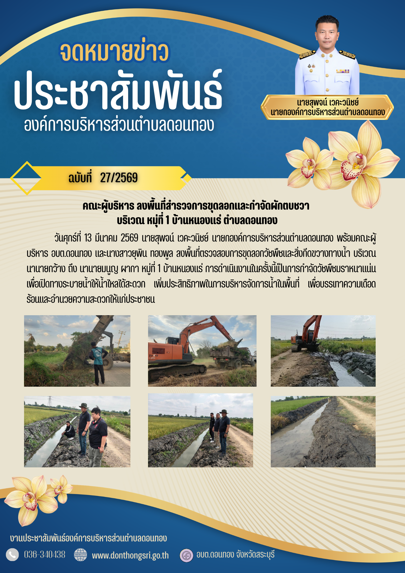 วันศุกร์ที่ 13 มีนาคม 2569 นายสุพจน์ เวคะวนิชย์ นายกองค์การบริหารส่วนตำบลดอนทอง พร้อมคณะผู้บริหาร อบต.ดอนทอง และนางสาวยุพิน ทองพูล ลงพื้นที่ตรวจสอบการขุดลอกวัชพืชและสิ่งกีดขวางทางน้ำ บริเวณนานายกว้าง ถึง นานายมนูญ ผากา หมู่ที่ 1 บ้านหนองแร่ การดำเนินงานในครั้งนี้เป็นการกำจัดวัชพืชมราหนาแน่นเพื่อเปิดทางระบายน้ำให้น้ำไหลได้สะดวก เพิ่มประสิทธิภาพในการบริหารจัดการน้ำในพื้นที่ เพื่อบรรเทาความเดือดร้อนและอำนวยความสะดวกให้แก่ประชาชน