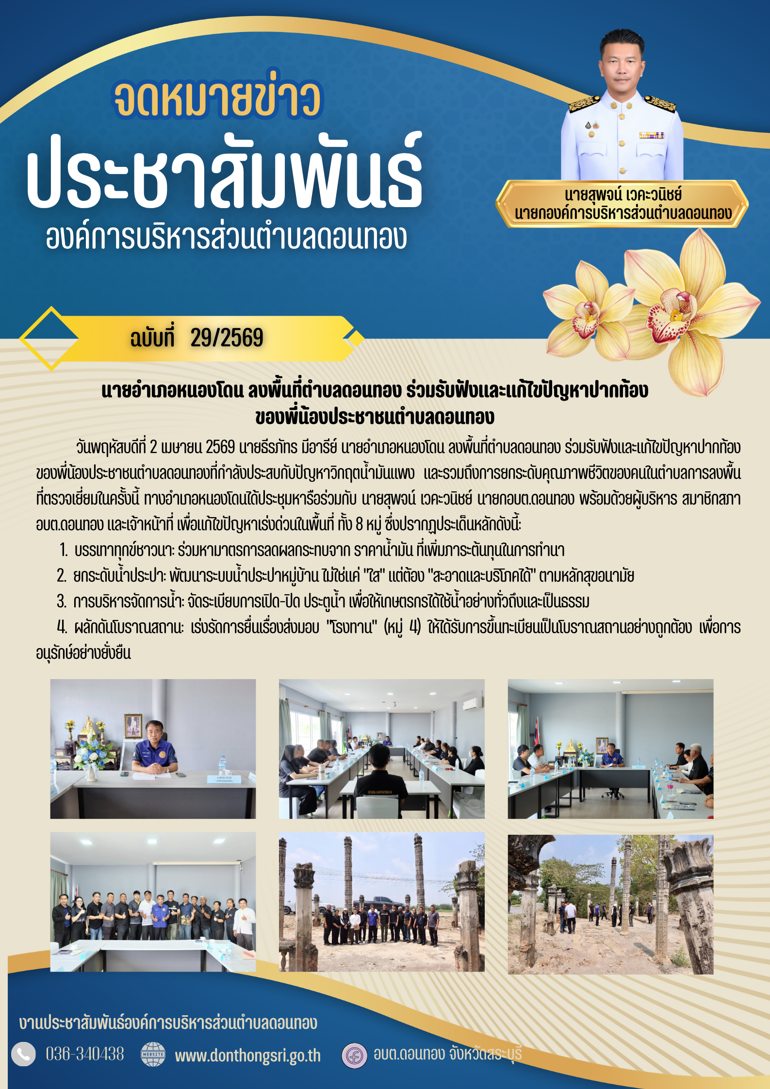 วันพฤหัสบดีที่ 2 เมษายน 2569 นายธีรภัทร มีอารีย์ นายอำเภอหนองโดน ลงพื้นที่ตำบลดอนทอง ร่วมรับฟังและแก้ไขปัญหาปากท้องของพี่น้องประชาชนตำบลดอนทองที่กำลังประสบกับปัญหาวิกฤตน้ำมันแพง และรวมถึงการยกระดับคุณภาพชีวิตของคนในตำบล การลงพื้นที่ตรวจเยี่ยมในครั้งนี้ ทางอำเภอหนองโดนได้ประชุมหารือร่วมกับ นายสุพจน์ เวคะวนิชย์ นายกอบต.ดอนทอง พร้อมด้วยผู้บริหาร สมาชิกสภาอบต.ดอนทอง และเจ้าหน้าที่ เพื่อแก้ไขปัญหาเร่งด่วนในพื้นที่ ทั้ง 8 หมู่ ซึ่งปรากฏประเด็นหลักดังนี้: