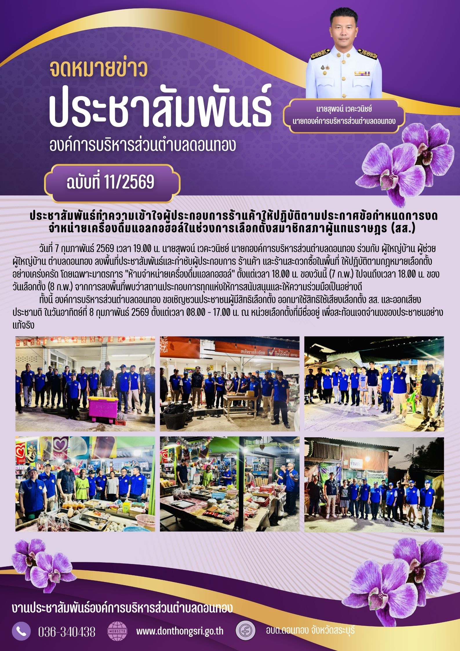 วันที่ 7 กุมภาพันธ์ 2569 เวลา 19.00 น. นายสุพจน์ เวคะวนิชย์ นายกองค์การบริหารส่วนตำบลดอนทอง ร่วมกับ ผู้ใหญ่บ้าน ผู้ช่วยผู้ใหญ่บ้าน ตำบลดอนทอง ลงพื้นที่ประชาสัมพันธ์และกำชับผู้ประกอบการ ร้านค้า และร้านสะดวกซื้อในพื้นที่ ให้ปฏิบัติตามกฎหมายเลือกตั้งอย่างเคร่งครัด โดยเฉพาะมาตรการ "ห้ามจำหน่ายเครื่องดื่มแอลกอฮอล์" ตั้งแต่เวลา 18.00 น. ของวันนี้ (7 ก.พ.) ไปจนถึงเวลา 18.00 น. ของวันเลือกตั้ง (8 ก.พ.) จากการลงพื้นที่พบว่าสถานประกอบการทุกแห่งให้การสนับสนุนและให้ความร่วมมือเป็นอย่างดี