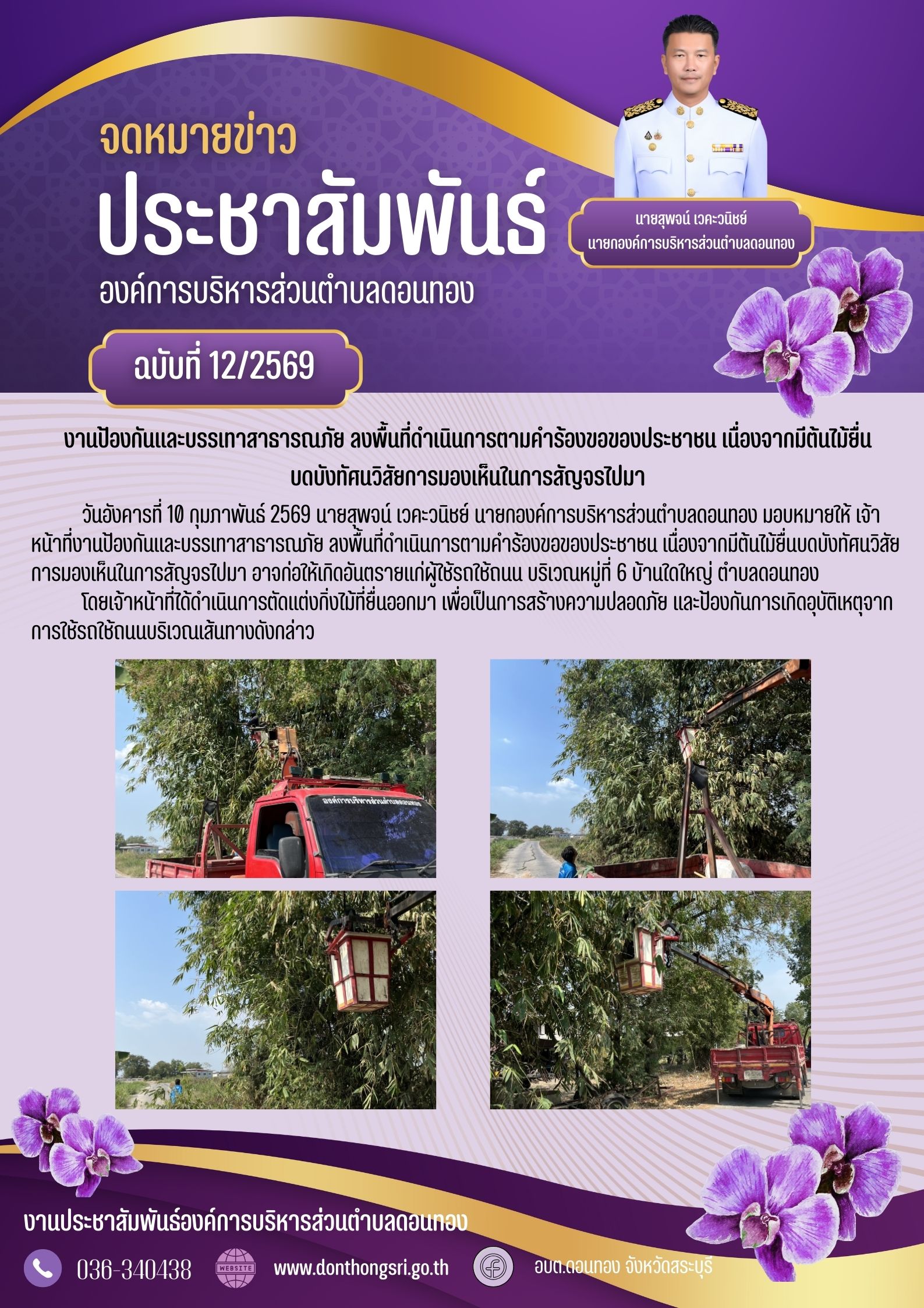 วันอังคารที่ 10 กุมภาพันธ์ 2569 นายสุพจน์ เวคะวนิชย์ นายกองค์การบริหารส่วนตำบลดอนทอง มอบหมายให้ เจ้าหน้าที่งานป้องกันและบรรเทาสาธารณภัย ลงพื้นที่ดำเนินการตามคำร้องขอของประชาชน เนื่องจากมีต้นไม้ยื่นบดบังทัศนวิสัยการมองเห็นในการสัญจรไปมา อาจก่อให้เกิดอันตรายแก่ผู้ใช้รถใช้ถนน บริเวณหมู่ที่ 6 บ้านใดใหญ่ ตำบลดอนทอง