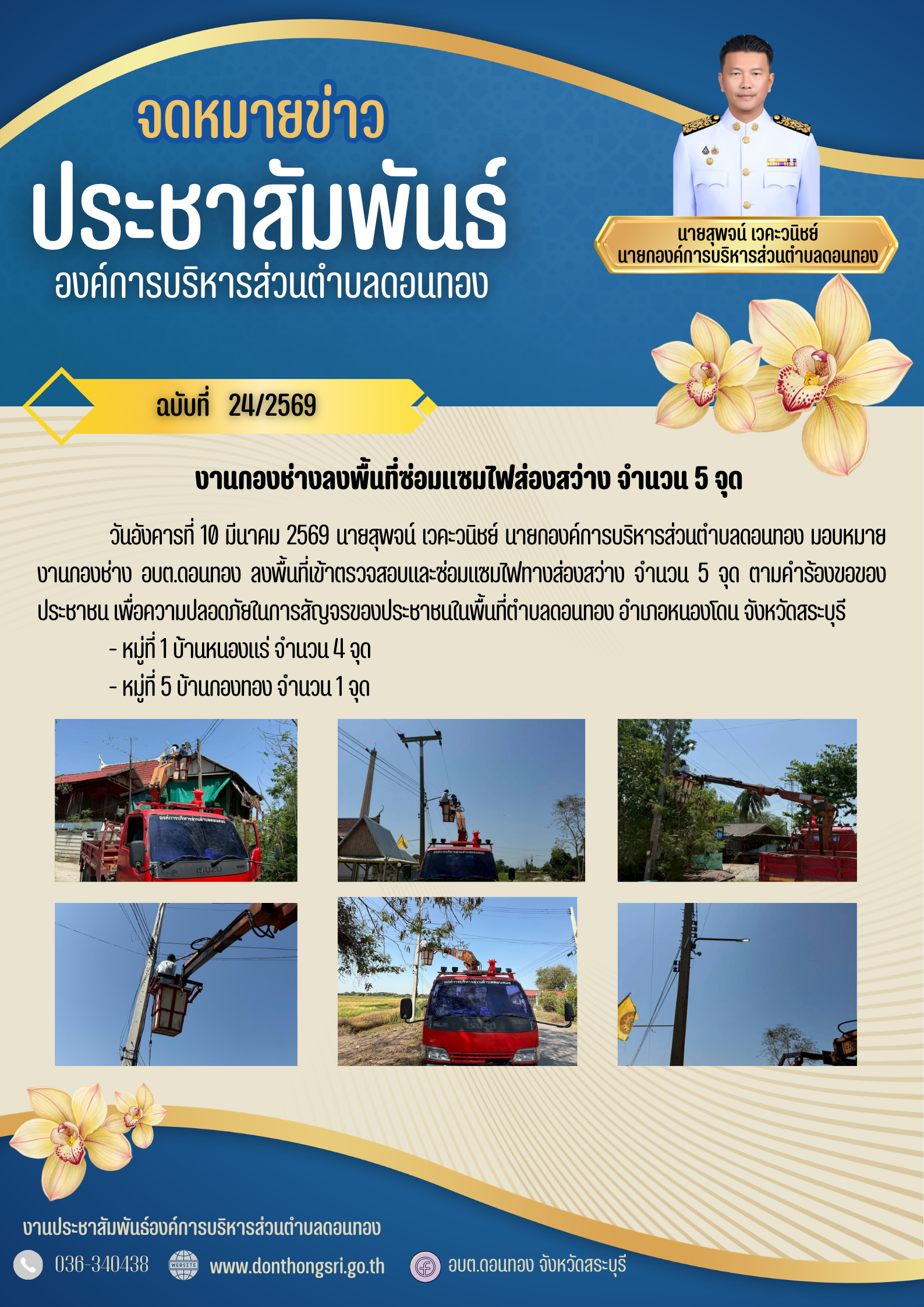 วันอังคารที่ 10 มีนาคม 2569 นายสุพจน์ เวคะวนิชย์ นายกองค์การบริหารส่วนตำบลดอนทอง มอบหมายงานกองช่าง อบต.ดอนทอง ลงพื้นที่เข้าตรวจสอบและซ่อมแซมไฟทางส่องสว่าง จำนวน 5 จุด ตามคำร้องขอของประชาชน เพื่อความปลอดภัยในการสัญจรของประชาชนในพื้นที่ตำบลดอนทอง อำเภอหนองโดน จังหวัดสระบุรี