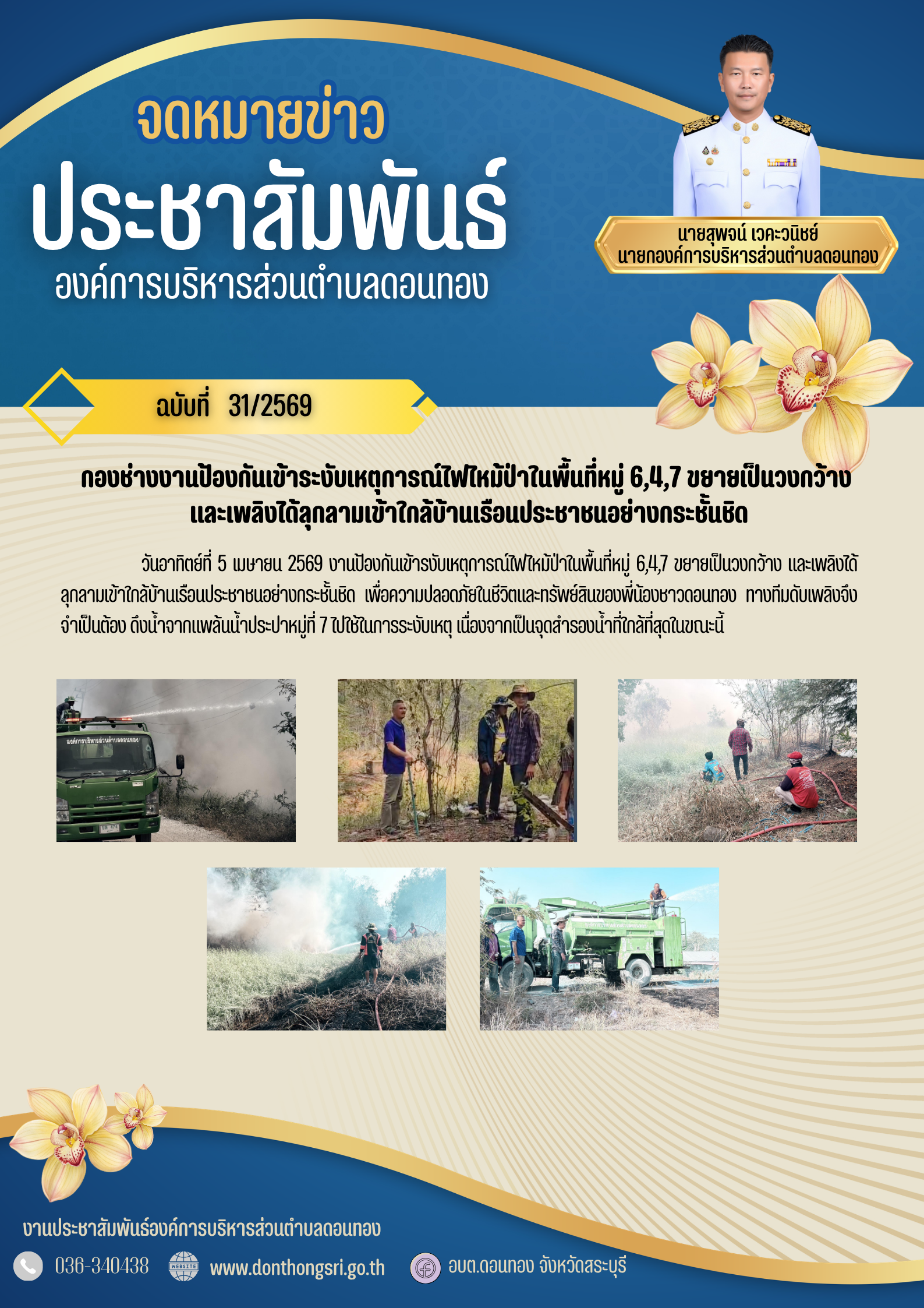 วันอาทิตย์ที่ 5 เมษายน 2569 งานป้องกันเข้ารงับเหตุการณ์ไฟไหม้ป่าในพื้นที่หมู่ 6,4,7 ขยายเป็นวงกว้าง และเพลิงได้ลุกลามเข้าใกล้บ้านเรือนประชาชนอย่างกระชั้นชิด เพื่อความปลอดภัยในชีวิตและทรัพย์สินของพี่น้องชาวดอนทอง ทางทีมดับเพลิงจึงจำเป็นต้อง ดึงน้ำจากแพล้นน้ำประปาหมู่ที่ 7 ไปใช้ในการระงับเหตุ เนื่องจากเป็นจุดสำรองน้ำที่ใกล้ที่สุดในขณะนี้