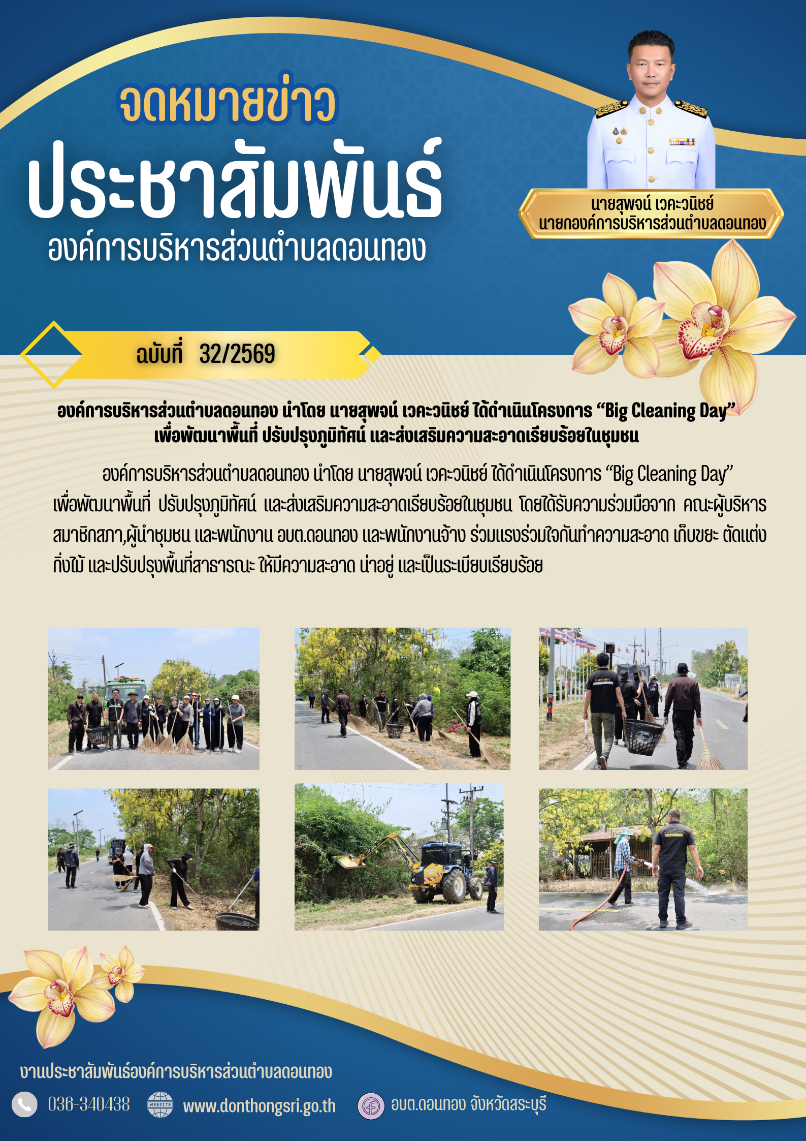 เมื่อวันพฤหัสบดีที่ 2 เมษายน 2569 เวลา 09.00 น. องค์การบริหารส่วนตำบลดอนทอง นำโดย นายสุพจน์ เวคะวนิชย์ ได้ดำเนินโครงการ “Big Cleaning Day”เพื่อพัฒนาพื้นที่ ปรับปรุงภูมิทัศน์ และส่งเสริมความสะอาดเรียบร้อยในชุมชน โดยได้รับความร่วมมือจาก คณะผู้บริหาร สมาชิกสภา,ผู้นำชุมชน และพนักงาน อบต.ดอนทอง และพนักงานจ้าง ร่วมแรงร่วมใจกันทำความสะอาด เก็บขยะ ตัดแต่งกิ่งไม้ และปรับปรุงพื้นที่สาธารณะ ให้มีความสะอาด น่าอยู่ และเป็นระเบียบเรียบร้อย